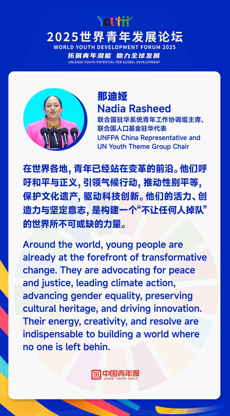 7月15日,在2025世界青年发展开幕式上,联合国驻华系统青年工作协调组主席、联合国人口基金驻华代表那迪娅致辞。